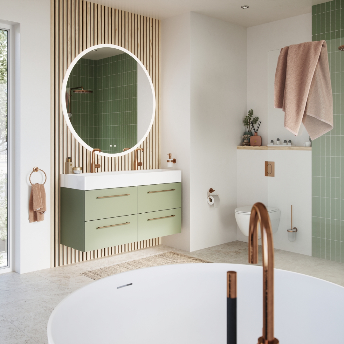 Eucalyptus grün ist ein mattes, neutrales Grün mit Grautönen. Für eine frische und originelle Farbe im Badezimmer. Auch sehr gut kombinierbar mit verschiedenen Holzstrukturen für einen natürlichen und eleganten Look.